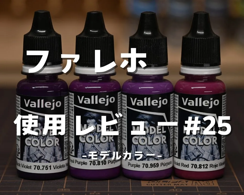 【ファレホ】「モデルカラー」ブラックバイオレット(70751)・ロイヤルパープル(70810)・パープル(70959)・バイオレットレッド(70812)の使用レビューです。いつも通りホワイトのプラスプーンに筆塗りし、色合いを見ていきます。