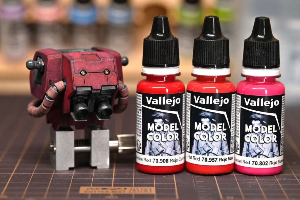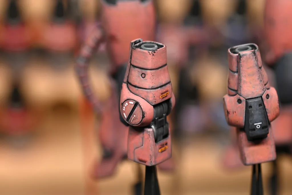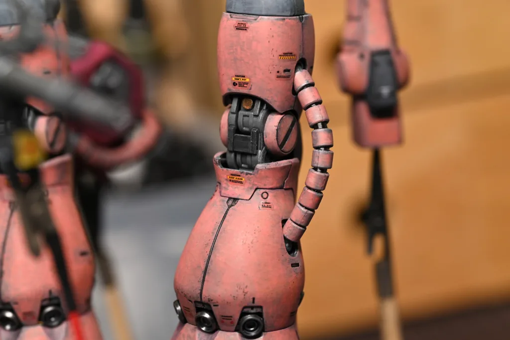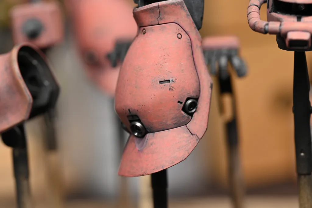 全身を占めるシャアピンクは1色目をダークローズ(70745)、2色目をフェーデッドレッド(70747)、そしてハイライトにライトオレンジ(70911)とライトイエロー(70949)をちょこちょこ乗せてみました。