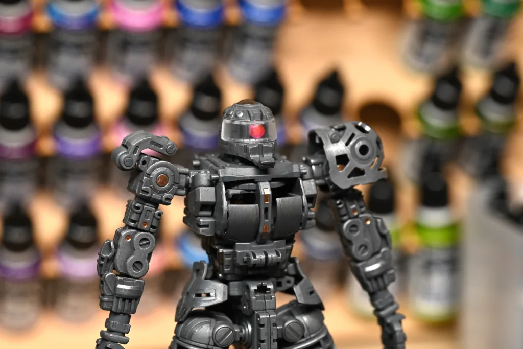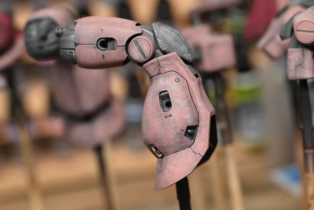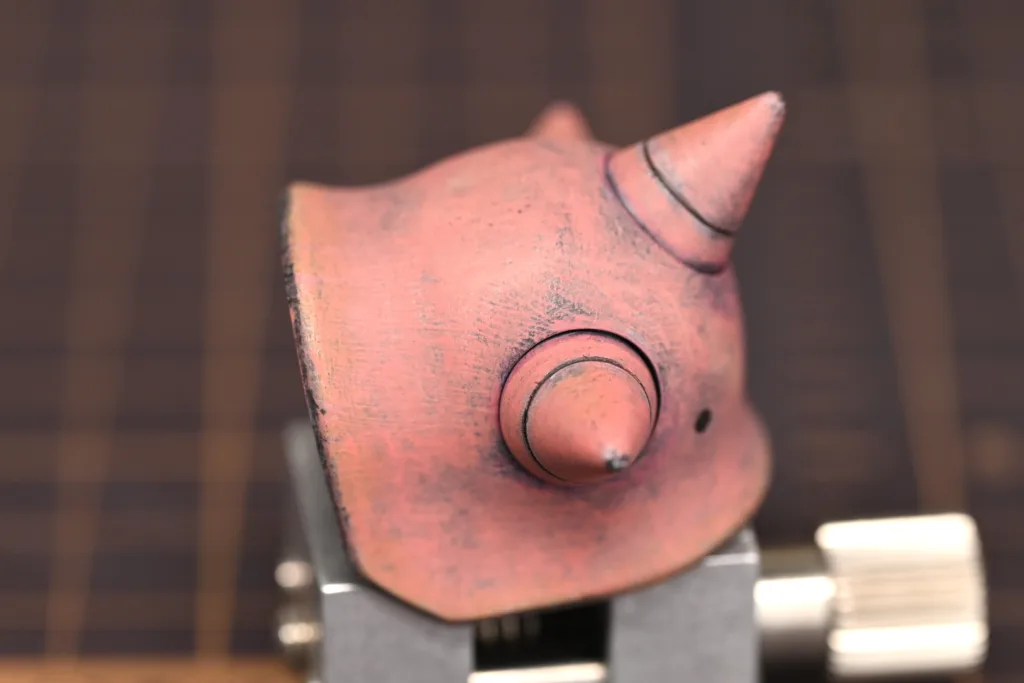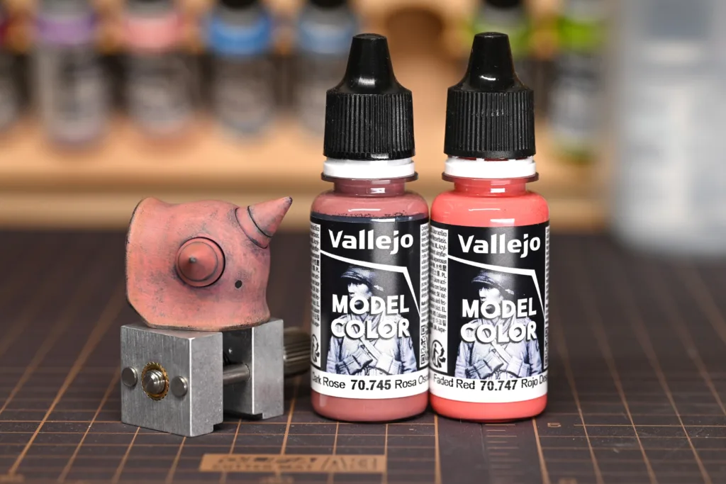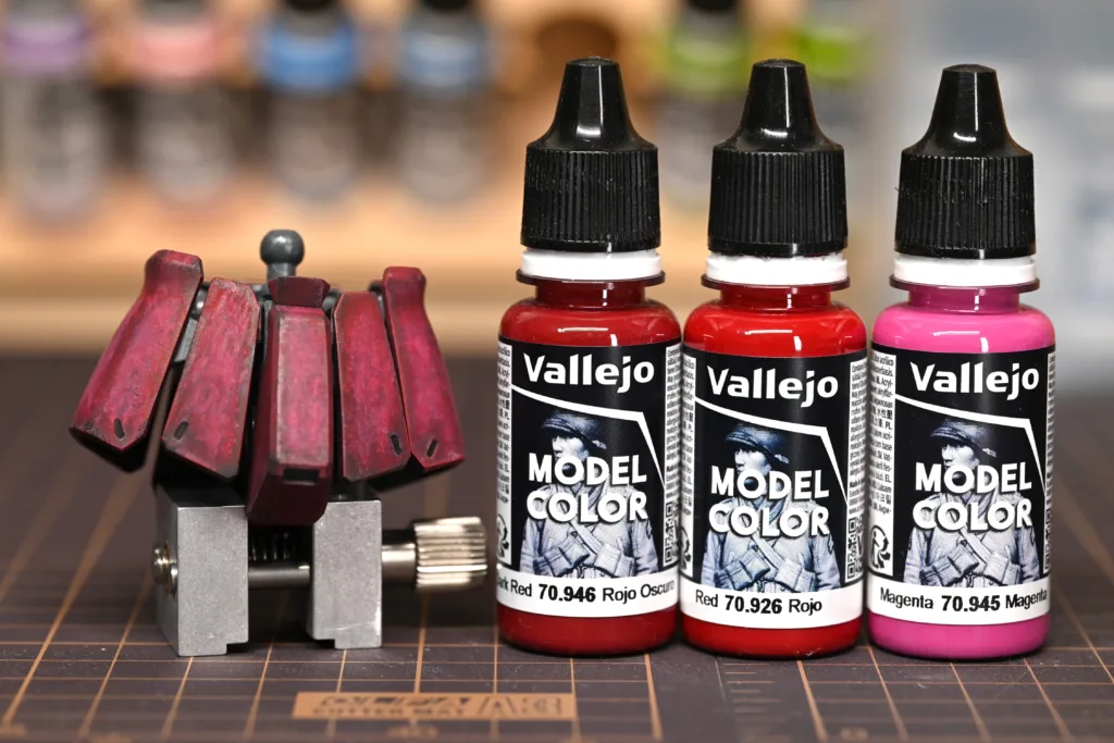 全身を占めるシャアピンクは1色目をダークローズ(70745)、2色目をフェーデッドレッド(70747)、そしてハイライトにライトオレンジ(70911)とライトイエロー(70949)をちょこちょこ乗せてみました。