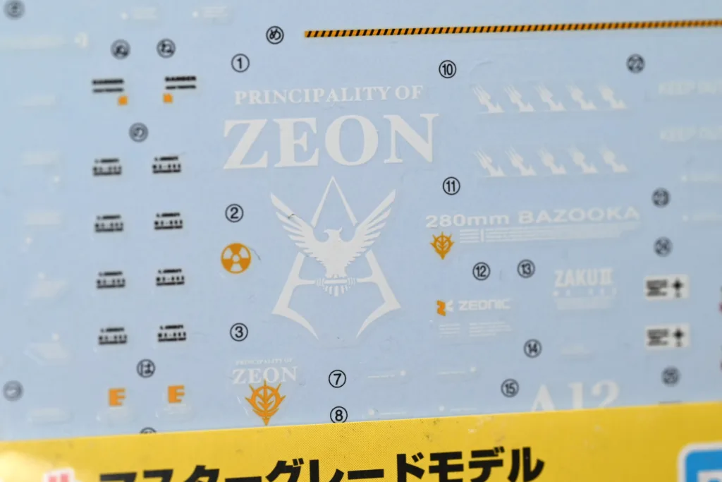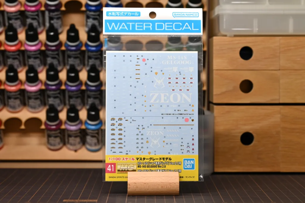 デカールはキット付属のドライデカールやマーキングシールは一切使用せず、「ガンダムデカールNo.41 MG 1/100 シャア専用ゲルググ Ver.2.0用/シャア専用ザク Ver.2.0用」のみを使いました。